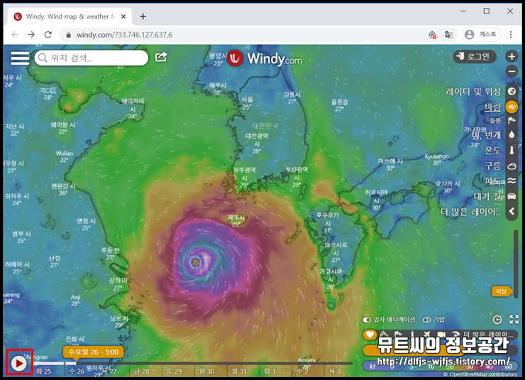 그리고 특히 지금은 태풍 바비가 제주도를 시작으로 한반도가 영향권에 들어가다 보니 태풍 예상 경로 등 검색이 많은데 윈디 사이트 왼쪽 하단의 ▶실행 버튼 을 누르면 날짜 및 시간별로 태풍 이동경로 및 기상 예상 정보를 확인해볼 수 있습니다