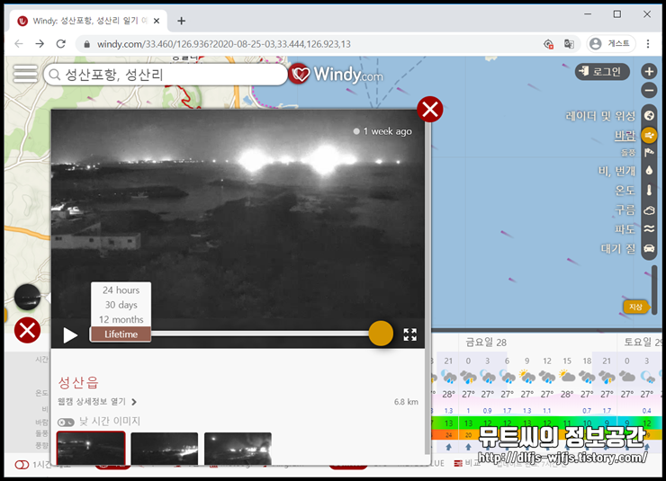 선택 지역의 실시간 영상 및 지난 날씨를 영상으로 확인해 볼 수 있습니다
