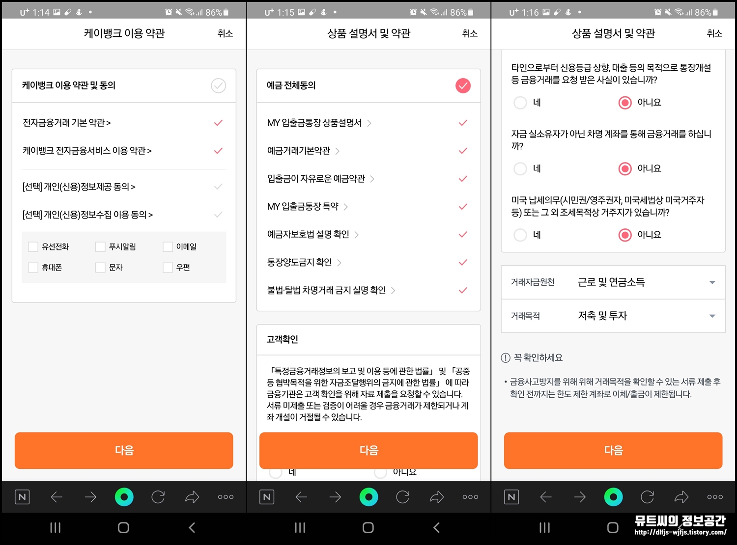 휴대폰 인증이 완료되면 케이뱅크 이용약관 동의 후 '다음' → 상품 설명서 약관 동의 · 거래자금 원천 및 거래목적 선택 후 다음 단계로 넘어갑니다