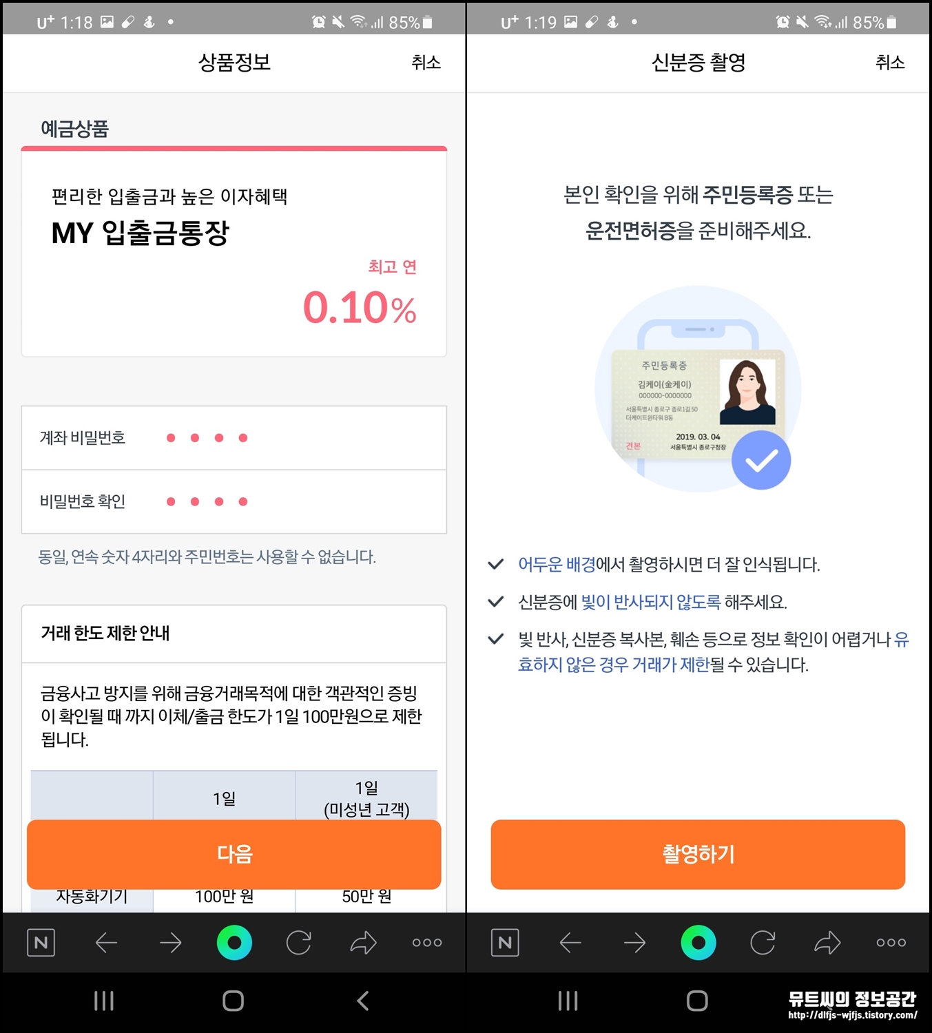 입출금 계좌에 사용할 비밀번호 4자리 입력 후 카메라 기능으로 주민등록증 혹은 운전면허증으로 본인 인증 촬영 후