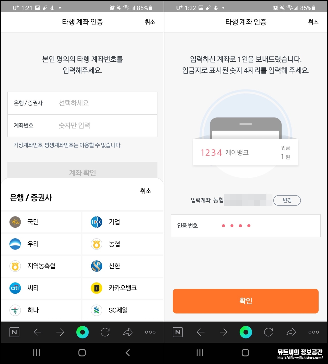 2차 본인 확인을 위해 본인 명의 타행 은행/증권사 계좌 입력 후 입력 계좌에 입금된 입금자의 이름으로 된 인증번호를 입력 후 '확인'을 누르면